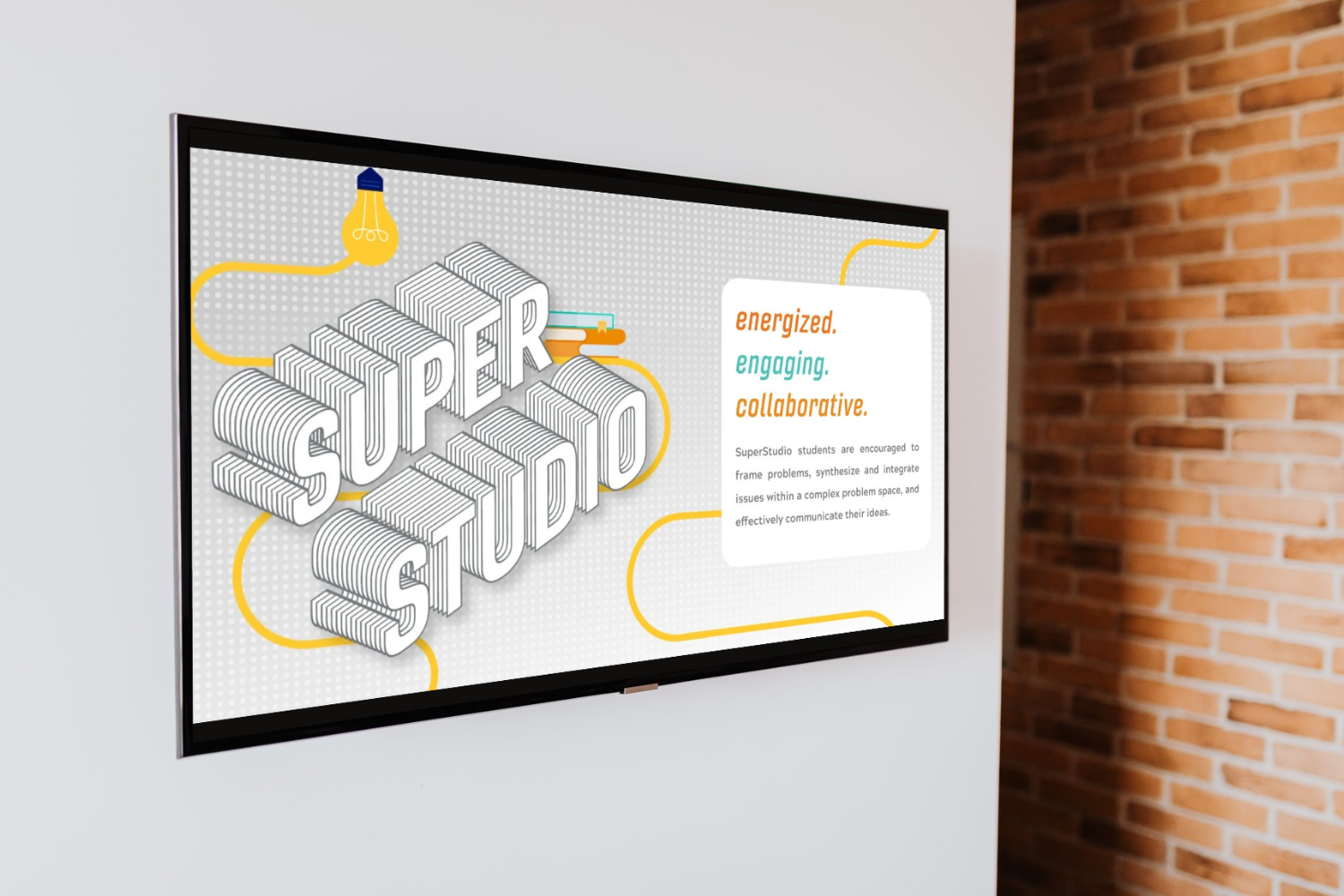 The branding was then adapted into digital signage to extend its reach beyond the hallway. SuperStudio graphics were displayed in multiple locations across the university, including the Honors College building at Hillcrest Hall, helping introduce the new space to a wider campus audience.