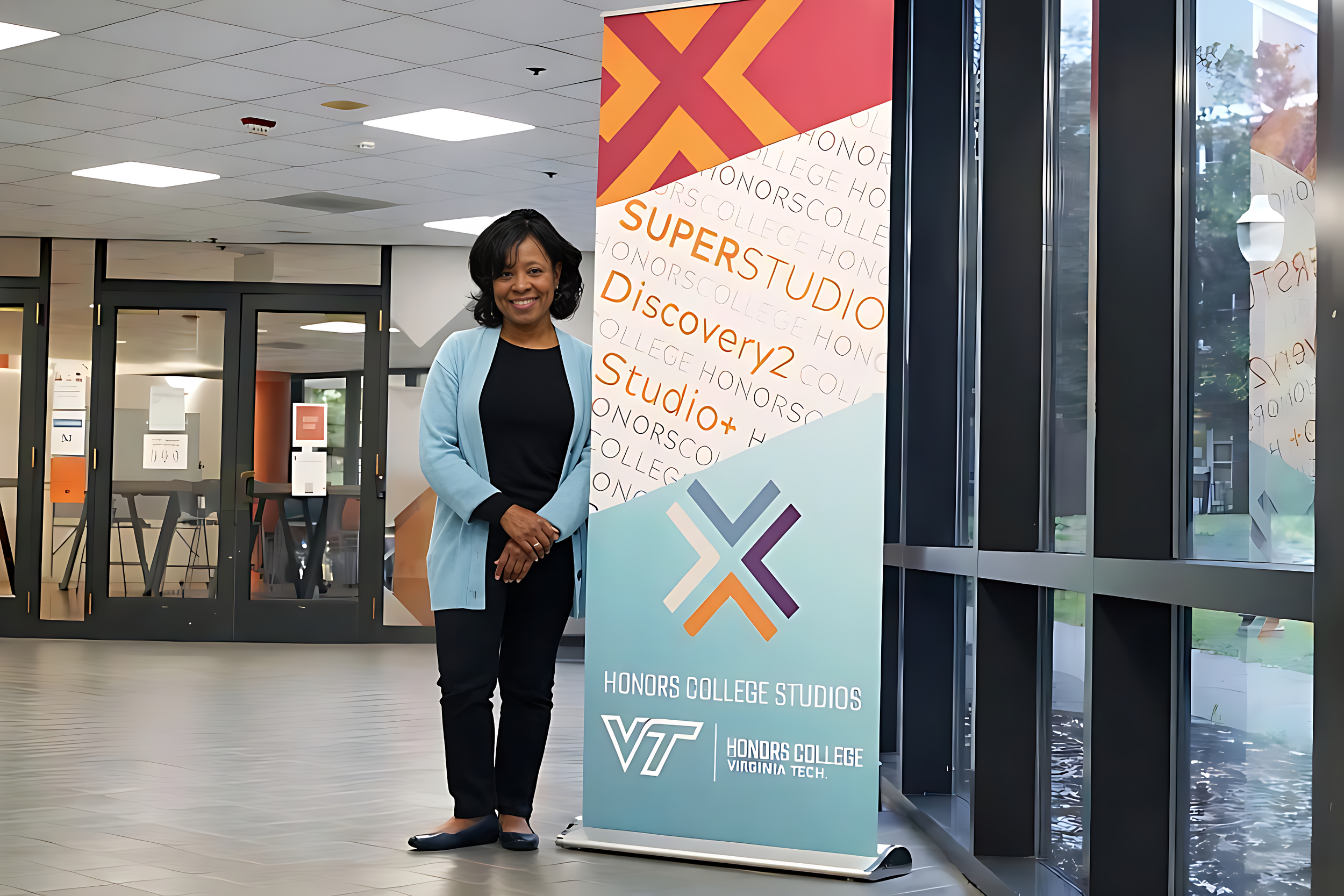 The work included coordinating a photoshoot of Dr. Joanie Banks-Hunt in the hallway leading into the Honors College Studios, capturing her presence alongside one of the newly designed SuperStudio banners I created. The image anchored a feature story that highlighted Dr. Banks-Hunt’s impact within the Honors College, connecting the physical space to the people and ideas that shape it.